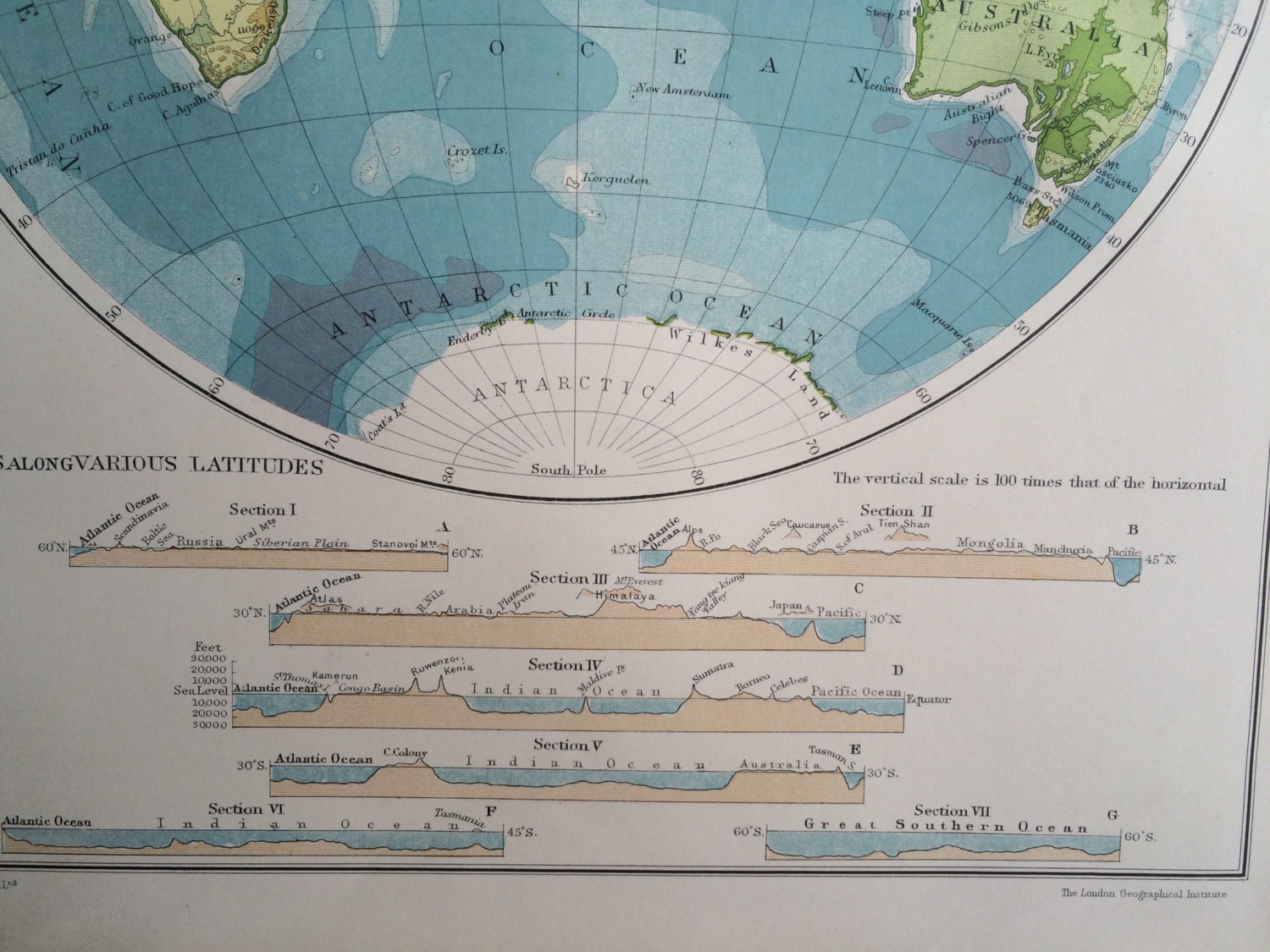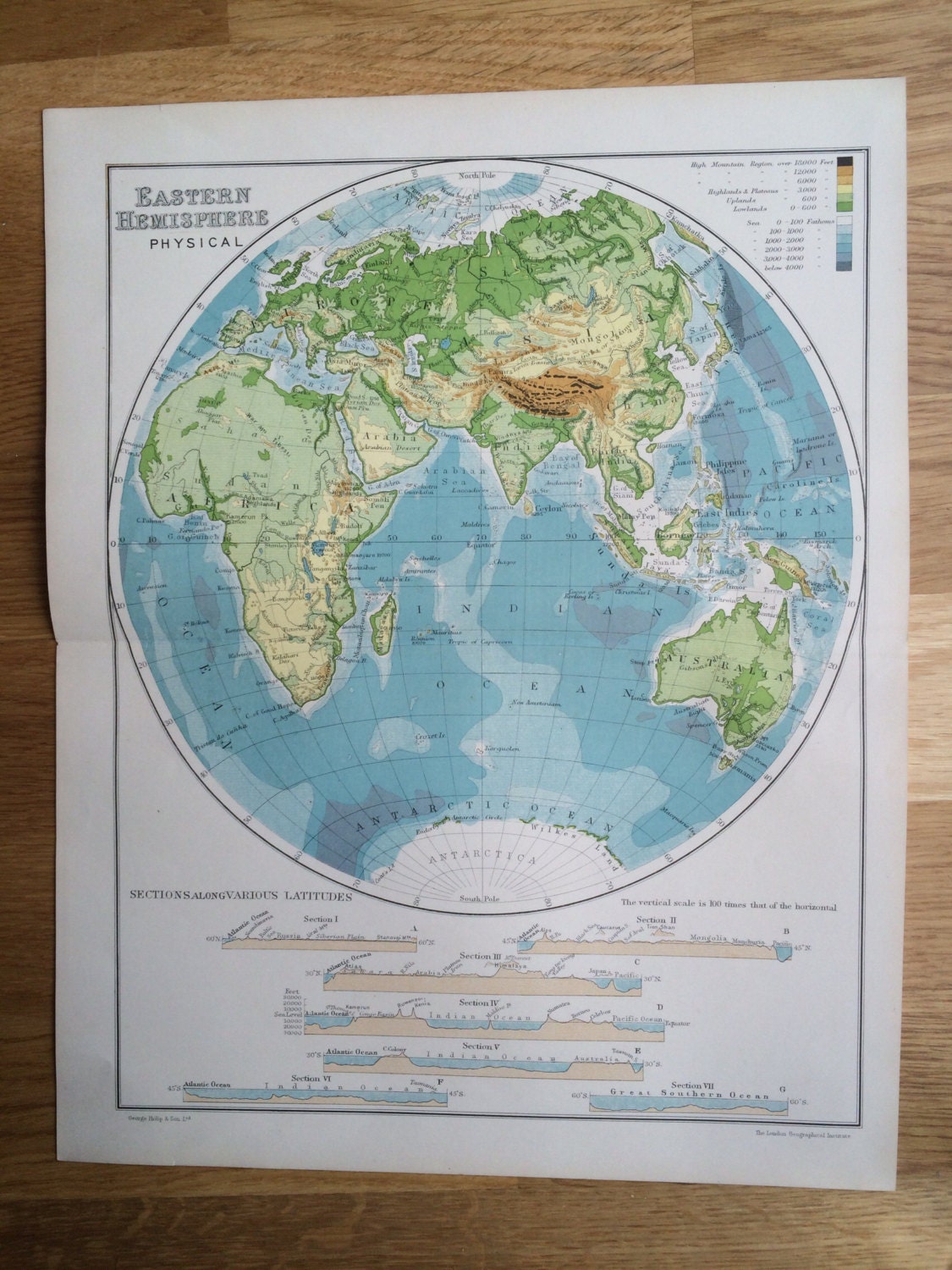 EASTERN HEMISPHERE (Pysical) Original Antique Map c.1910, 10.5 x 13.5 inches, Philips' Atlas, Home Decor, Cartography, Geography