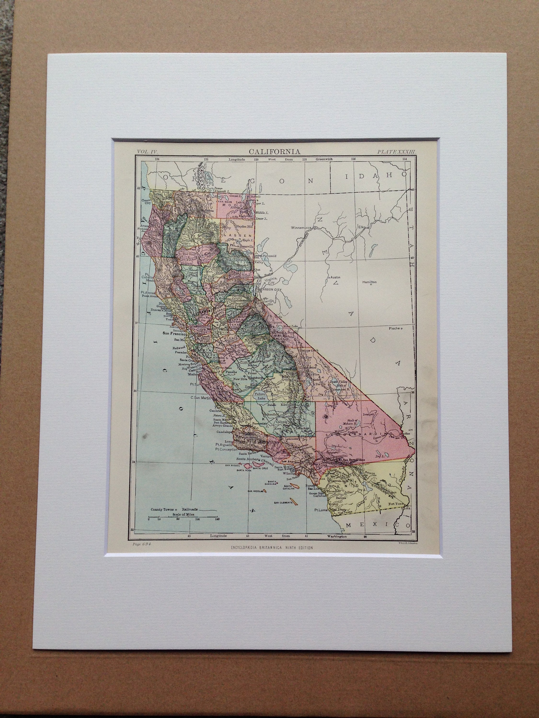 This map is available mounted, matted in antique white or black and is also available framed. We use archival matting methods so your map will be held in place with photo corners and will not be fixed to either the mat or the backing board.
