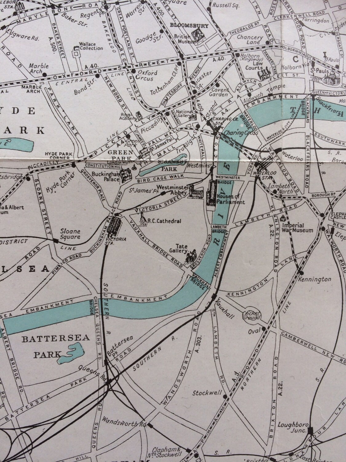 This is an original vintage map, not a reproduction or modern copy. It is dated c. 1940s and taken from a London guide book.