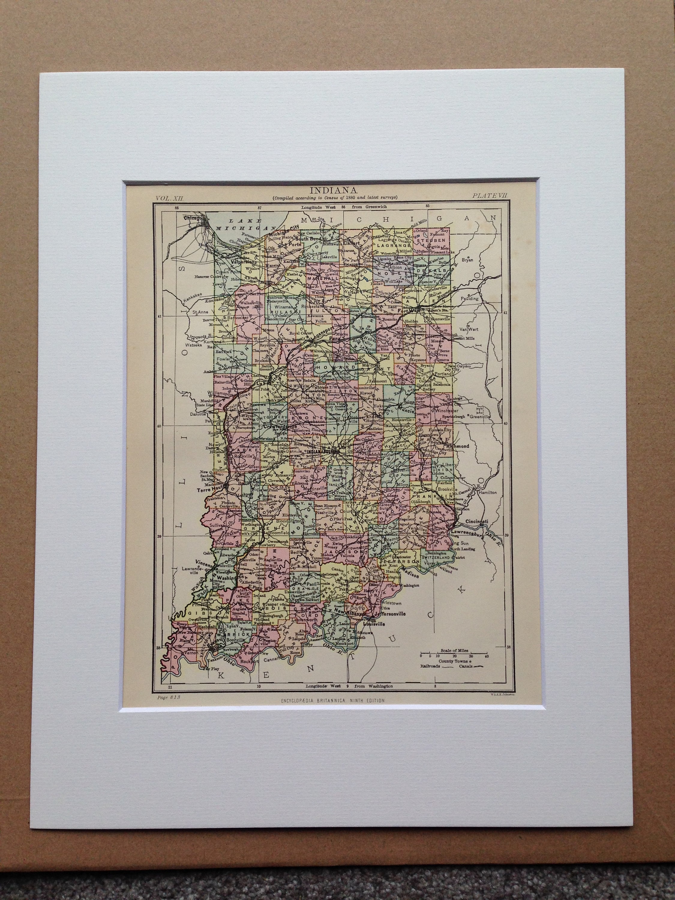 This map is available mounted, matted in antique white or black and is also available framed. We use archival matting methods so your map will be held in place with photo corners and will not be fixed to either the mat or the backing board.