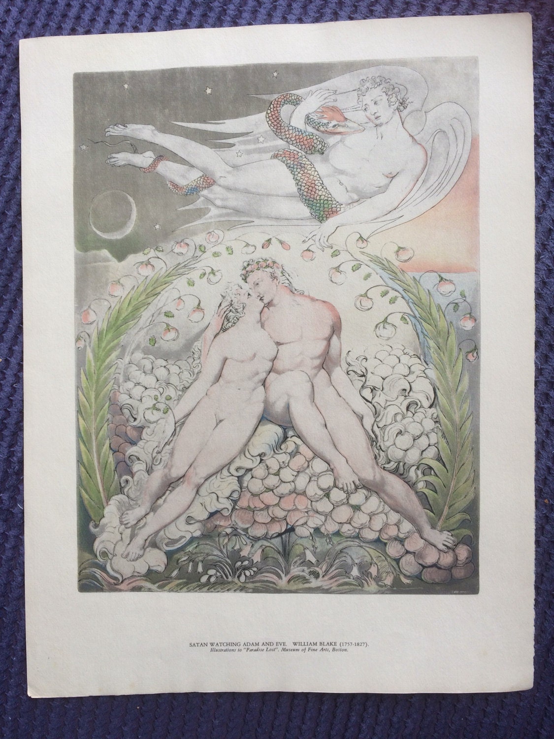 This is an original large vintage folio print from 1947, not a reproduction or modern copy. It is taken from a folio published by the Museum of Fine Arts Boston and is one of a collection of 9 illustrations by William Blake depicting scenes from John Milton's renowned poem Paradise Lost. It is a beautiful and rare print and would look wonderful framed.
