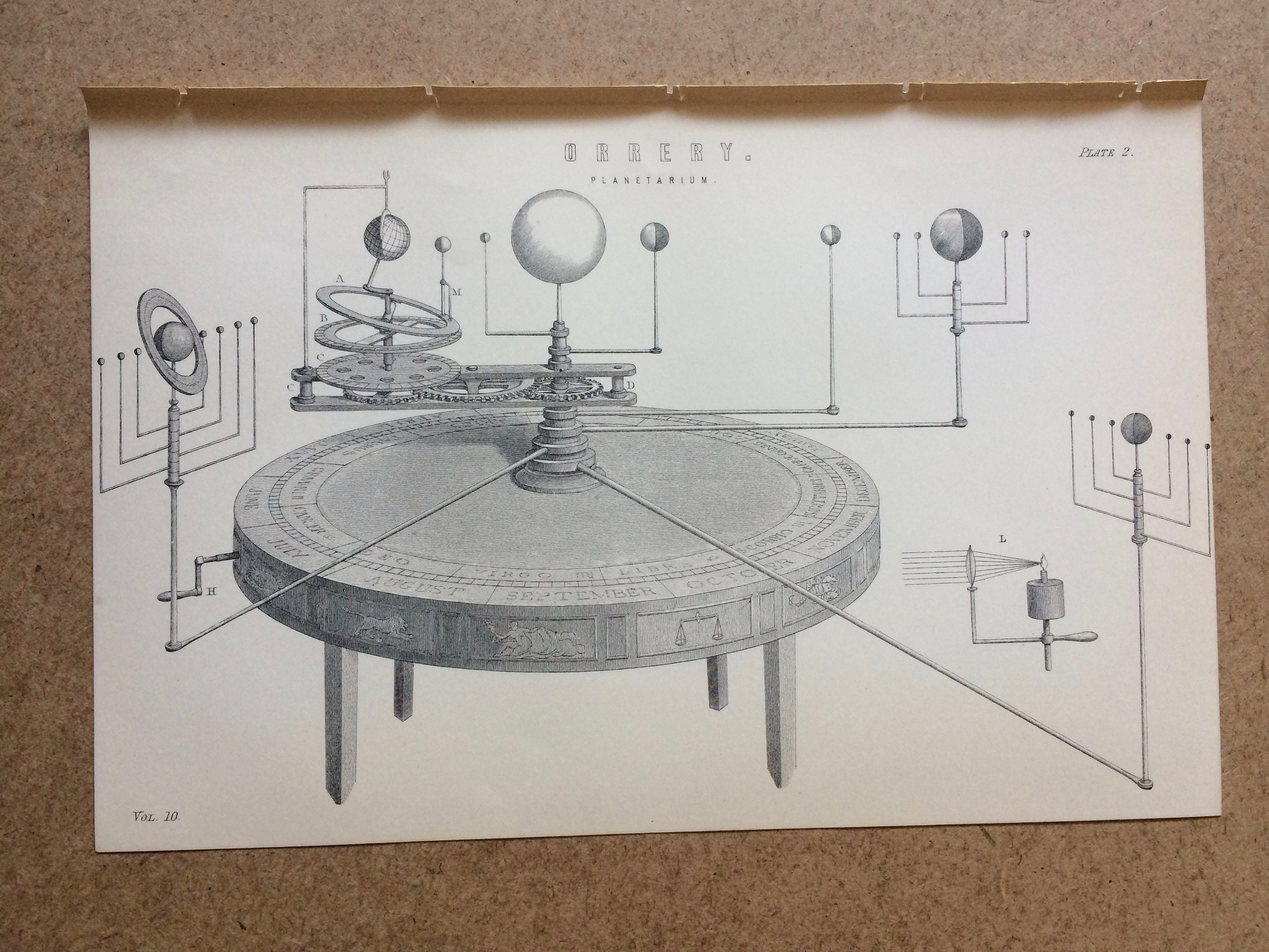 1891 Planetarium Orrery Original Antique Encyclopaedia Steel Engraving - Astronomy - Plants - Astrology - Stars - Star Gazing - Zodiac
