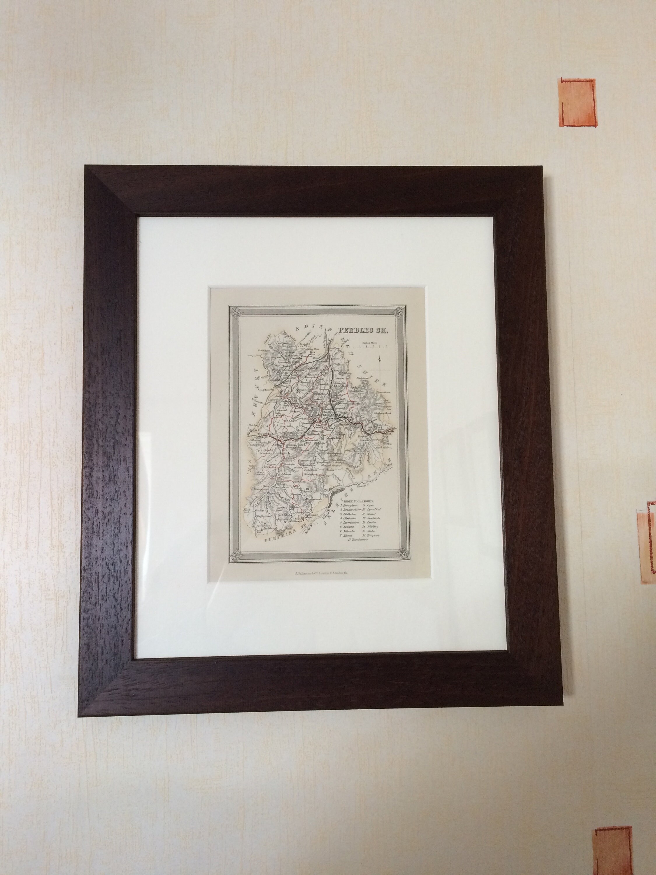 This map is available mounted and matted in antique white or black (as pictured) and is also available framed. We use archival matting methods so your map will be held in place with photo corners and will not be fixed to either the mat or the backing board.