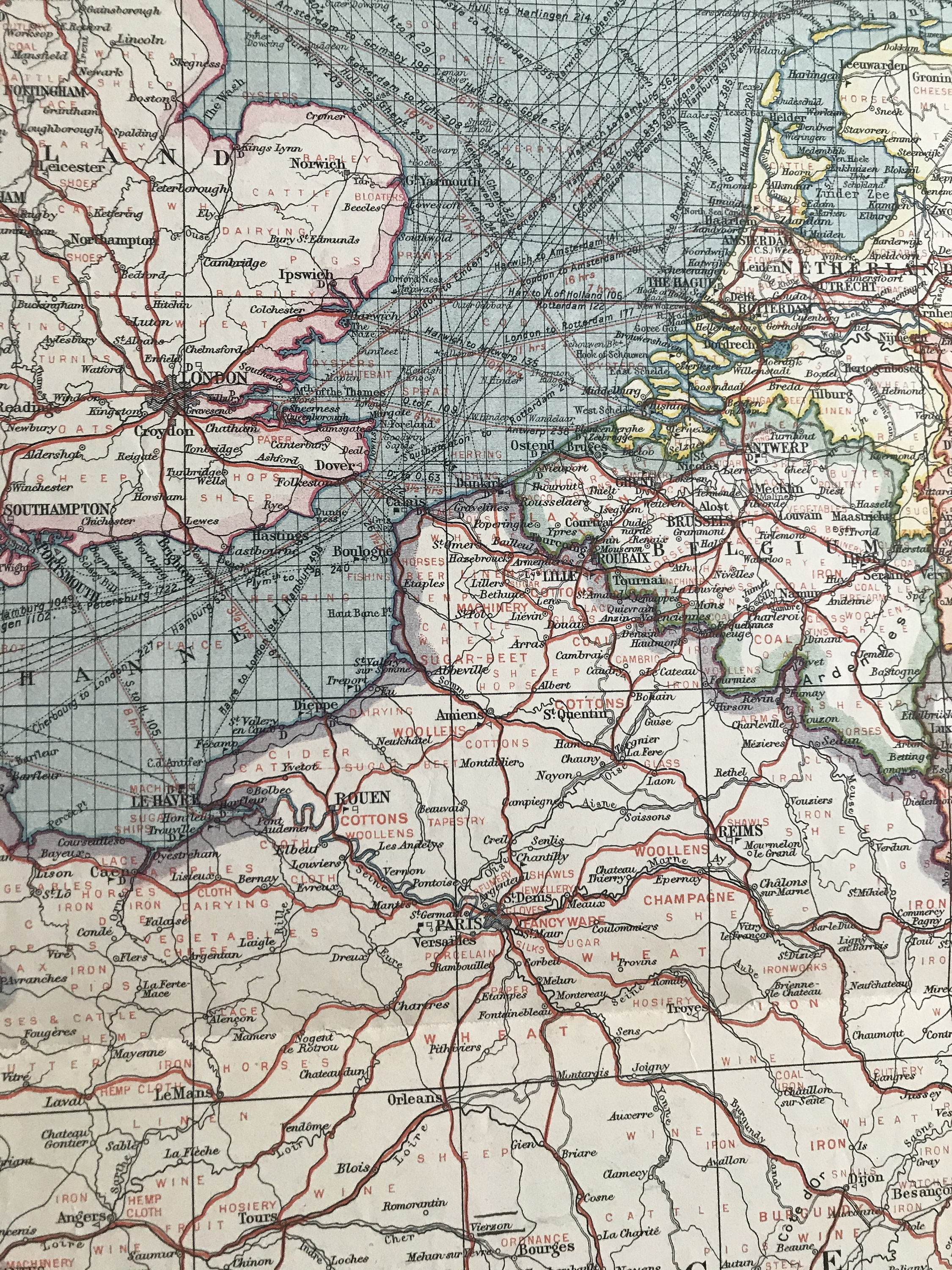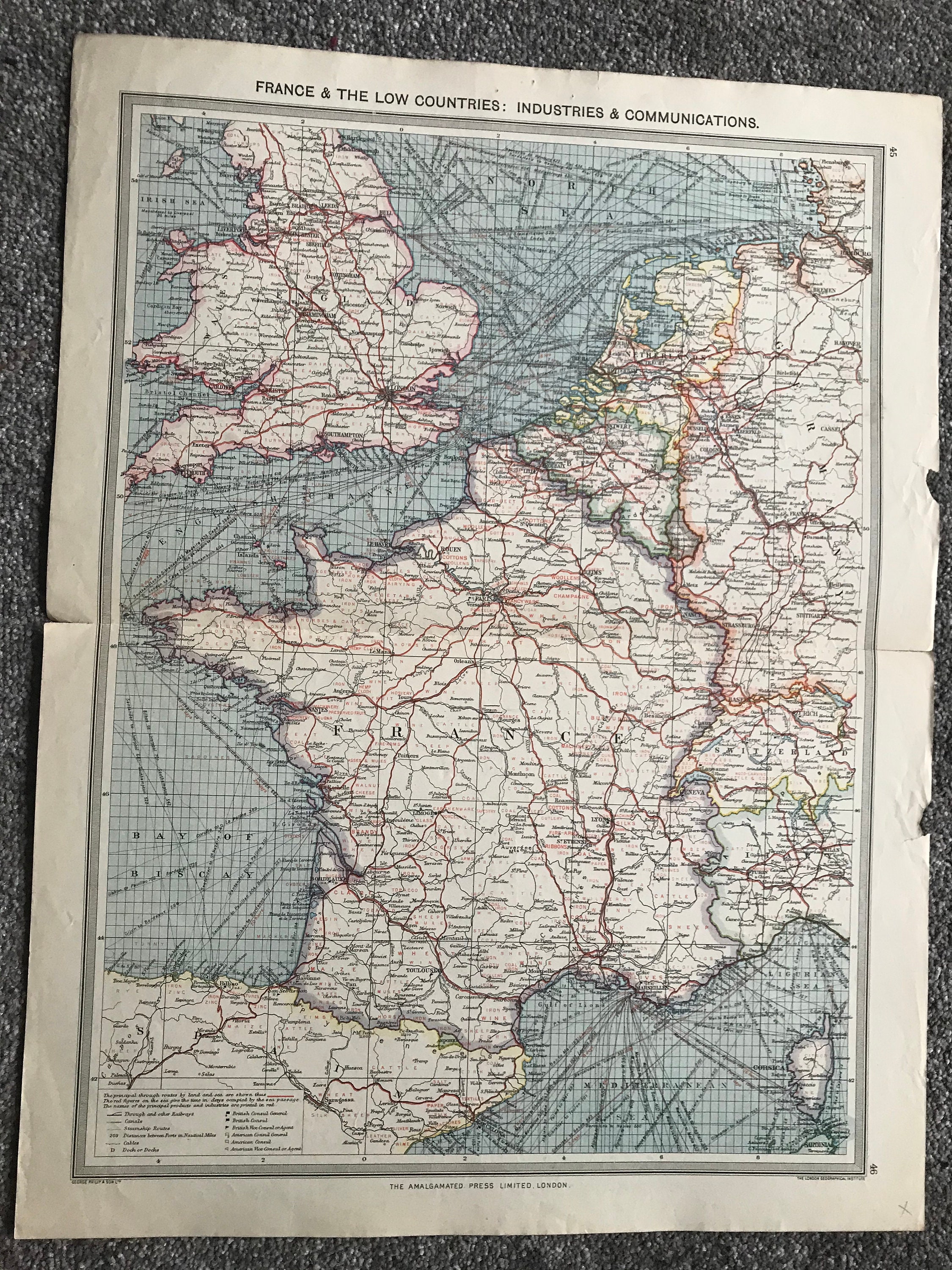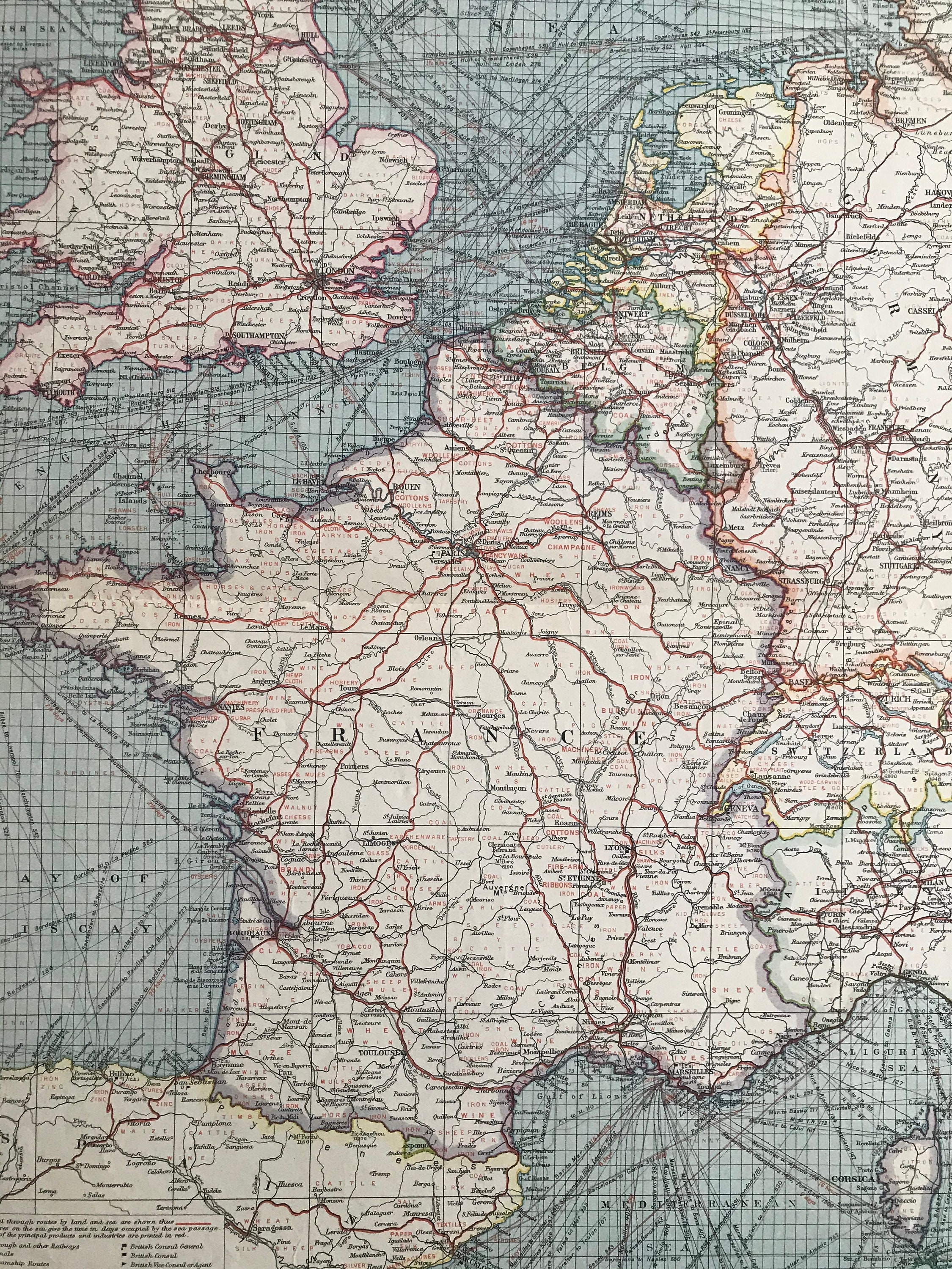 1903 France & The Low Countries - Industries and Communications Original Antique Map showing Consuls, Railways, Steamship Routes, Canals