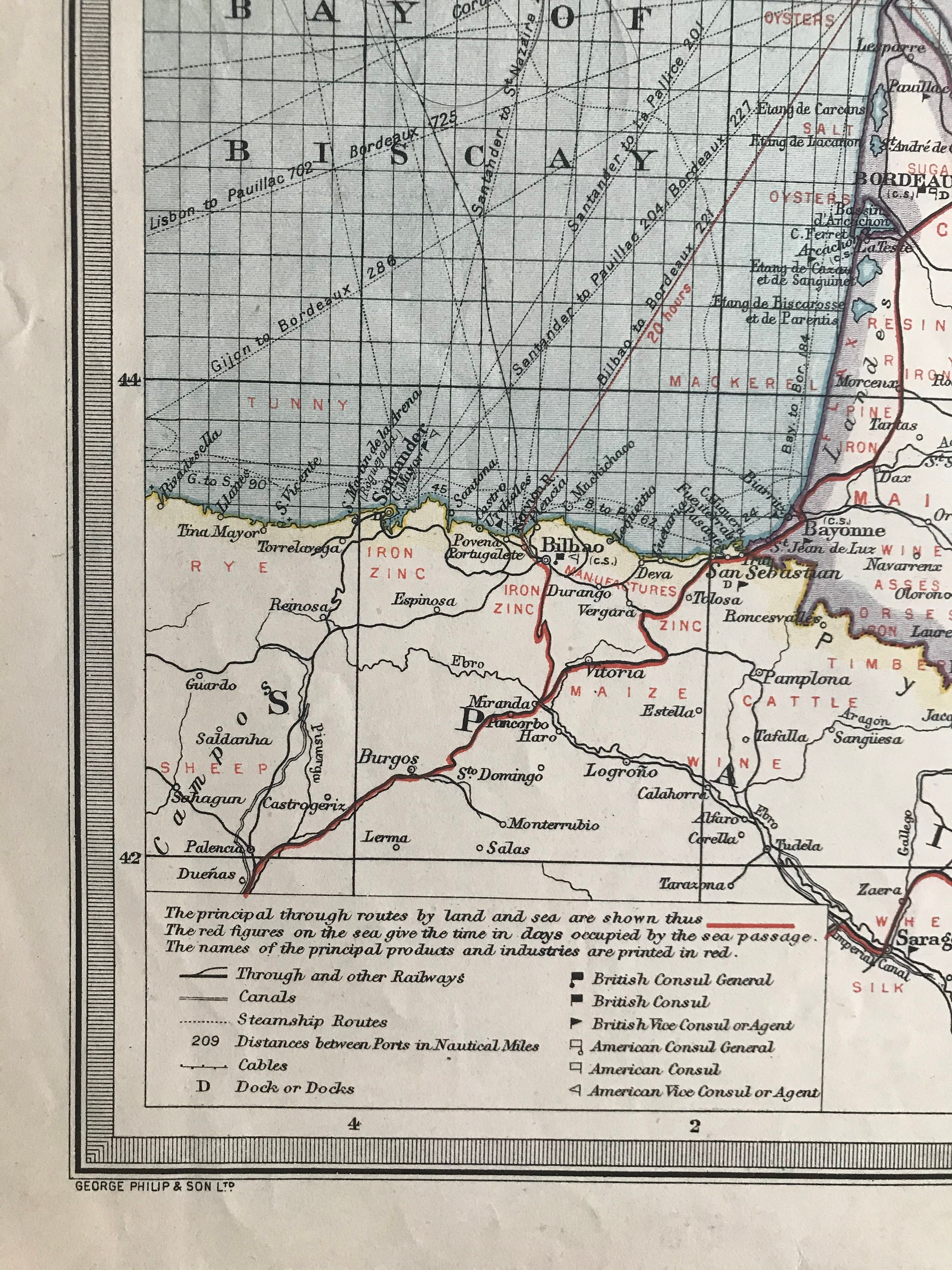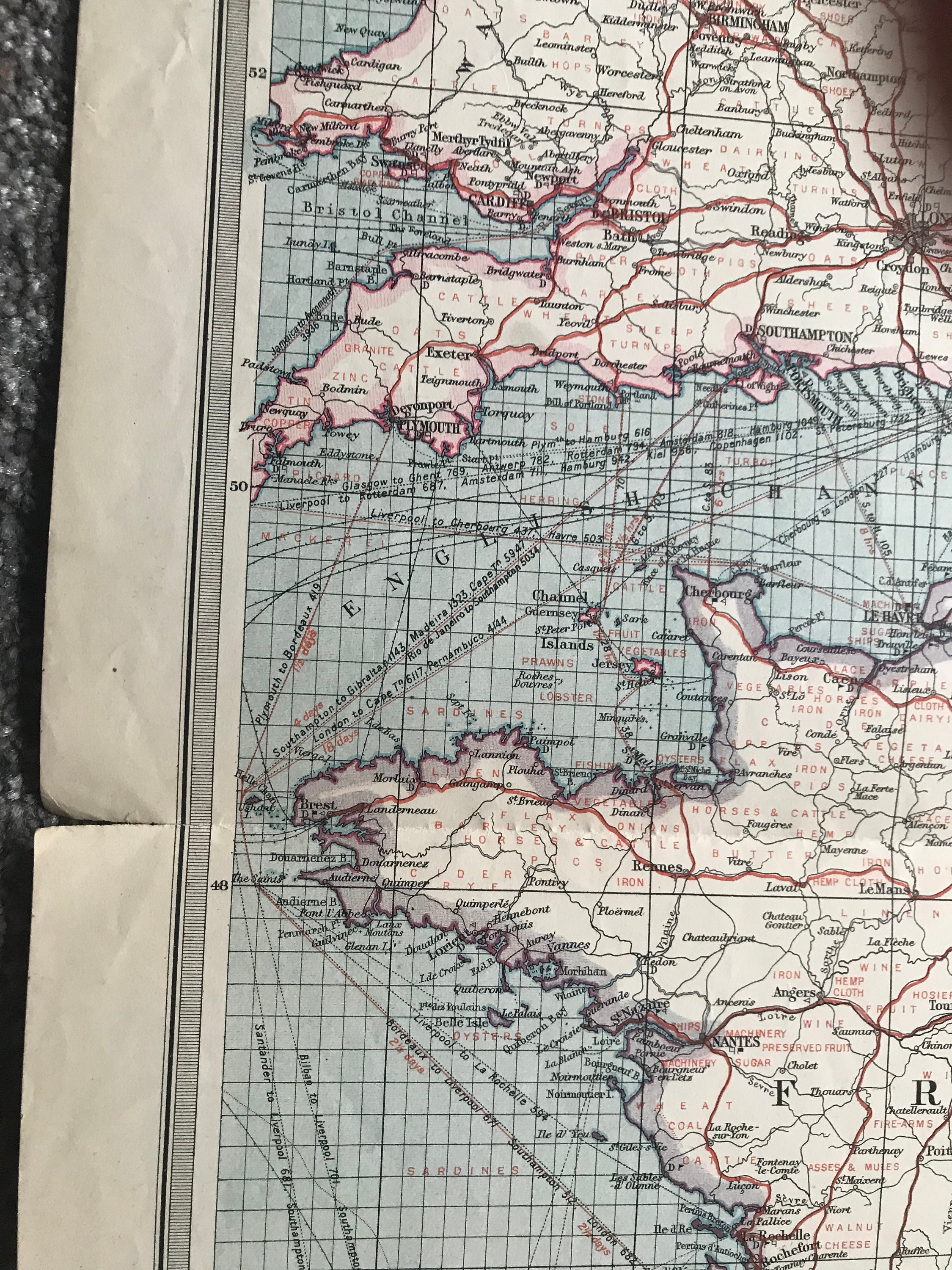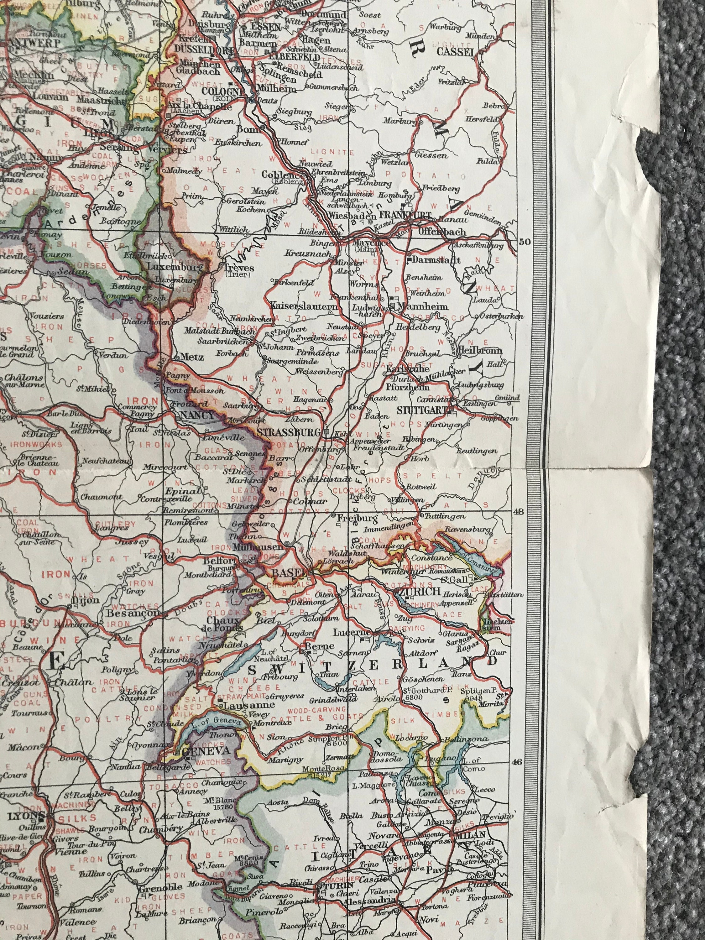 1903 France & The Low Countries - Industries and Communications Original Antique Map showing Consuls, Railways, Steamship Routes, Canals