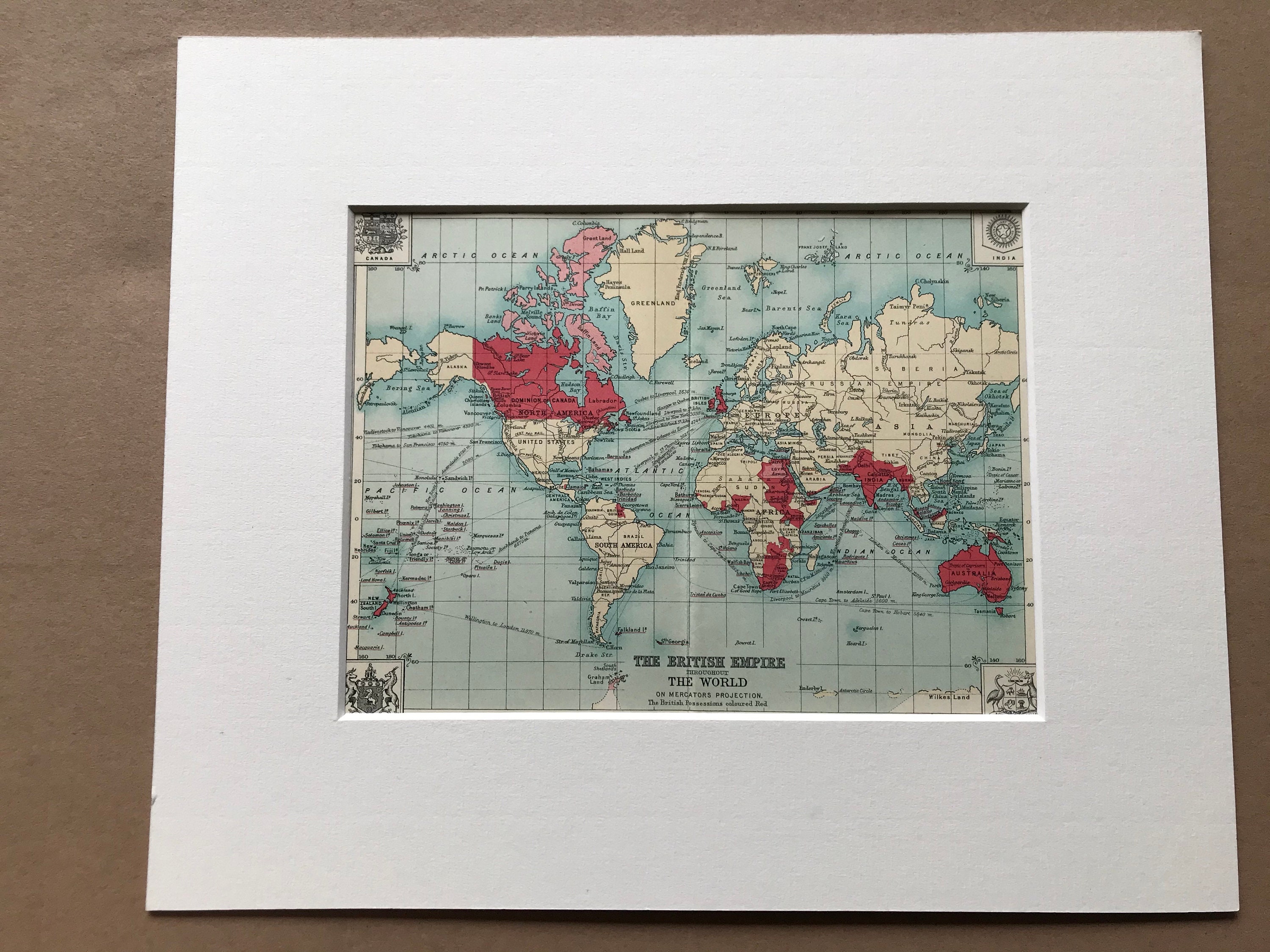This map comes mounted, matted in antique white or black and is also available framed. We use archival matting methods so your map will be held in place with photo corners and will not be fixed to either the mat or the backing board.