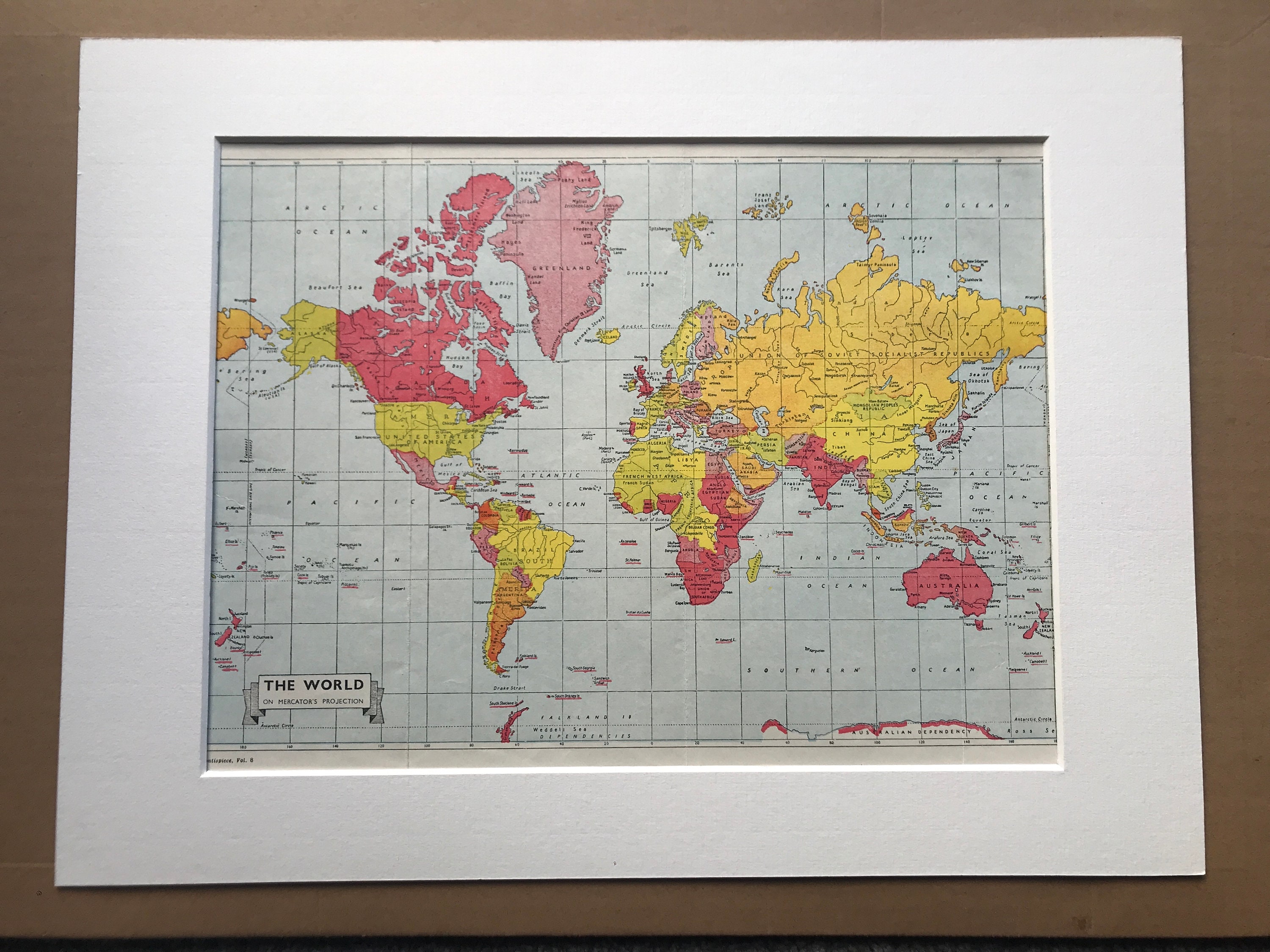 This map comes mounted and matted in antique white or black. We use archival matting methods so your map will be held in place with photo corners and will not be fixed to either the mat or the backing board.