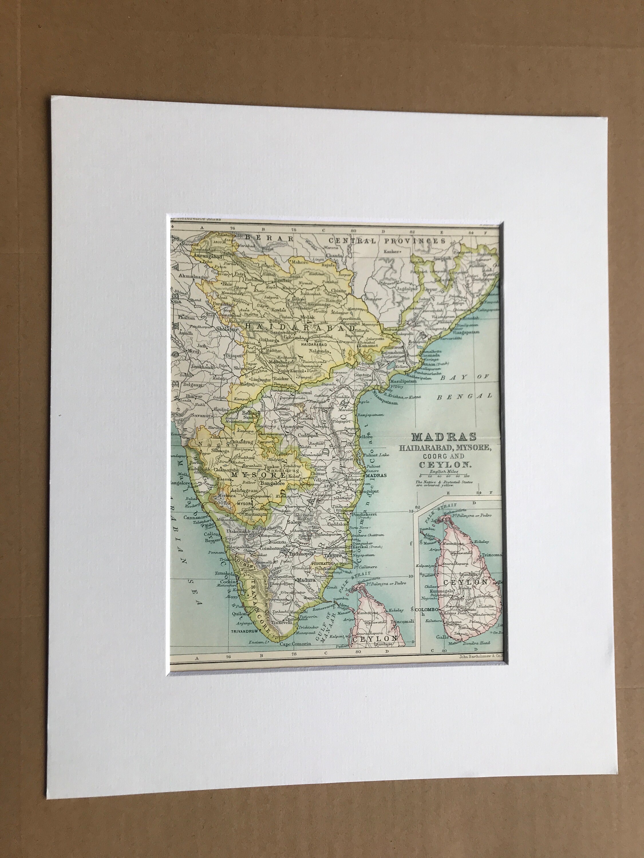 This map comes mounted, matted in antique white or black and is also available framed. We use archival matting methods so your map will be held in place with photo corners and will not be fixed to either the mat or the backing board.