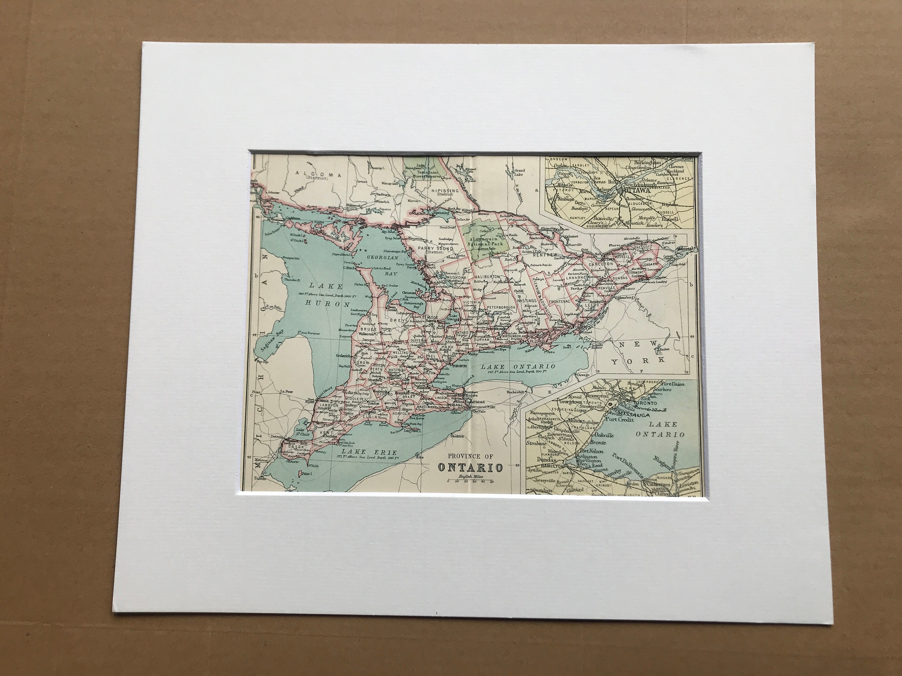 This map comes mounted, matted in antique white or black and is also available framed. We use archival matting methods so your map will be held in place with photo corners and will not be fixed to either the mat or the backing board.
