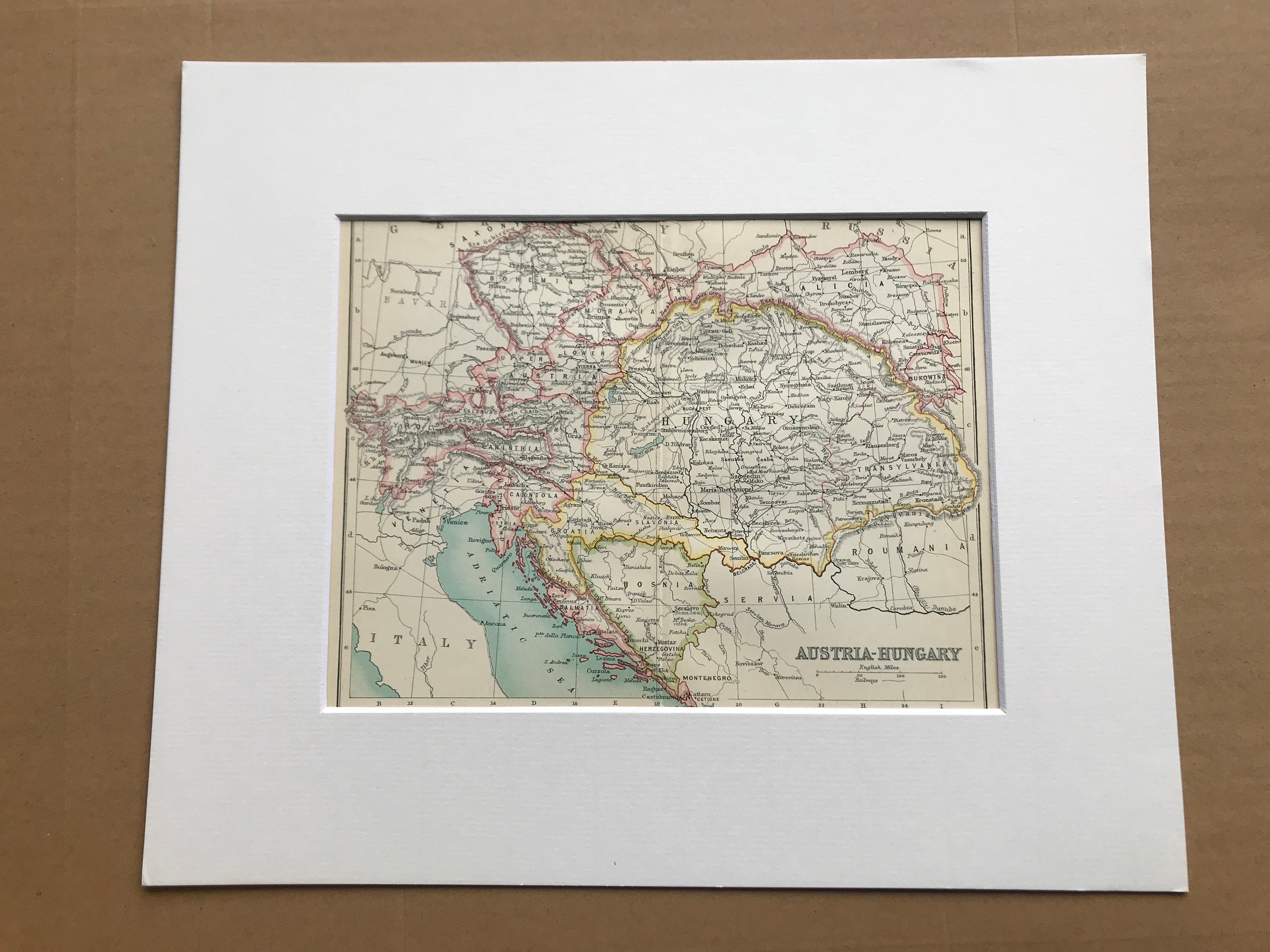 This map comes mounted, matted in antique white or black and is also available framed. We use archival matting methods so your map will be held in place with photo corners and will not be fixed to either the mat or the backing board.